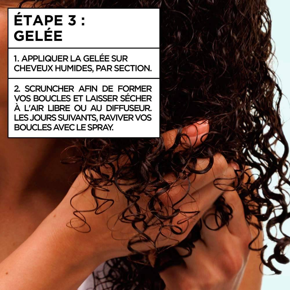 [Étape 3] La gelée combine la puissance d'un complexe hydratant à l'acide hyaluronique et agent gainant pour 100H de boucles hydratées(1). Grâce à sa texture gel elle hydrate instantanément et sculpte vos boucles pour une tenue flexible et longue durée. Fixe sans figer.