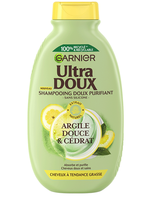 Véritable recette de purification du cuir chevelu pour les cheveux à tendance grasse, Garnier Ultra Doux associe les bienfaits de l’Argile Douce, réputée pour ses vertus absorbantes, au Cédrat, reconnu pour son action purifiante et rafraîchissante.