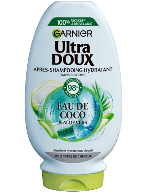 Véritable recette d’hydratation pour gorger de nutrition les cheveux normaux sans les alourdir, le shampooing Garnier Ultra Doux associe l’Eau de Coco, connue pour être une source d’hydratation naturelle à l’Aloe Vera, réputé pour apporter fraîcheur et douceur.