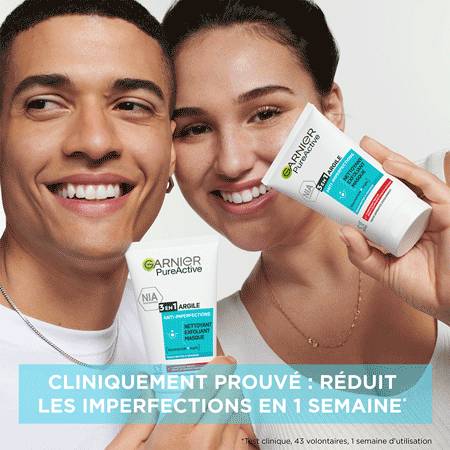 Enrichi en NIACINAMIDE, et en ARGILE, le 3 EN 1 Argile réduit les imperfections et les pores en 1 semaine* pour une peau purifiée et un teint plus uniforme.